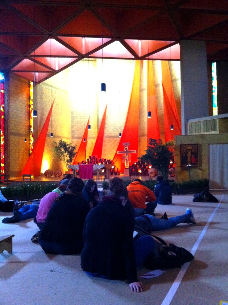 Ce matin : premières gouttes de pluie du séjour, Youpi ! Après l'introduction biblique du frère Jasper,nous nous sommes réfugié dans l'église pour les temps de partage en groupe. À 15h, le silence est imposé pendant 3 min pour signifier la mort du Christ et ce soir durant la messe nous irons déposer notre front sur la croix. Même si le ciel demeure gris l'ambiance reste lumineuse.