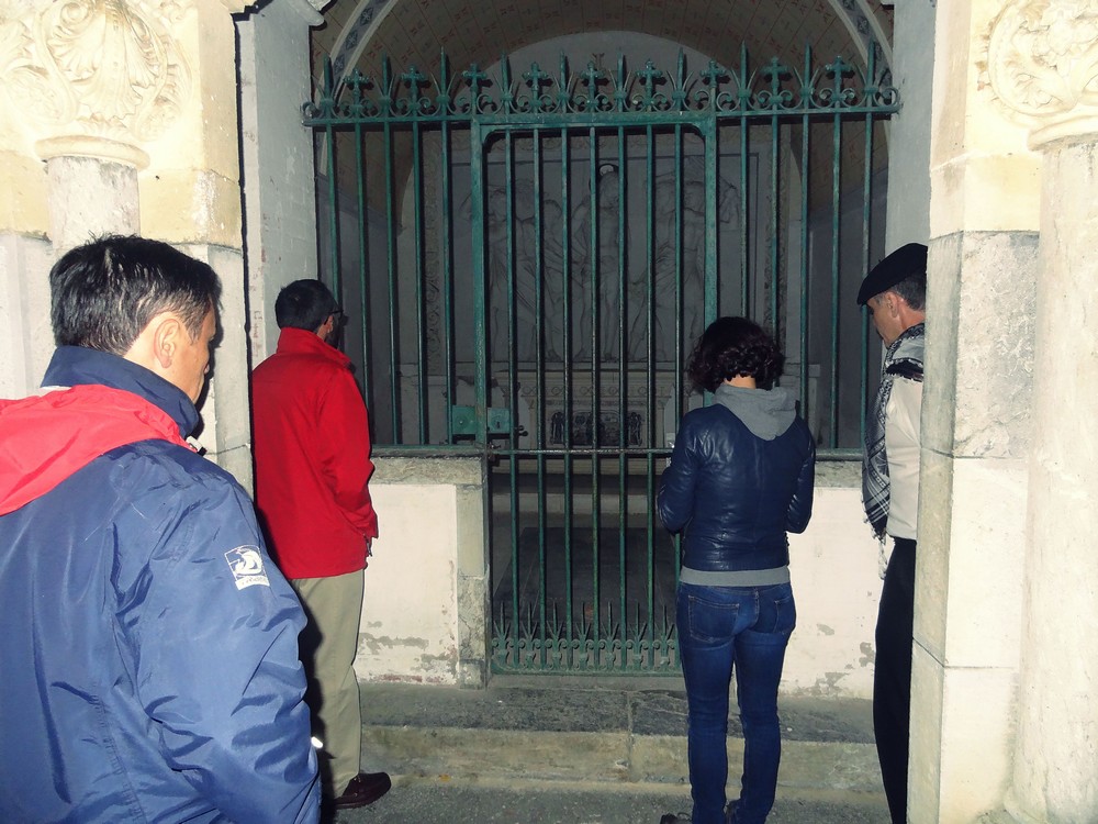 Recueillement nocturne devant la IVe station du Chemin de Bétharram. Nous n'avons que nos téléphones et un gadget de poche pour nous éclairer.